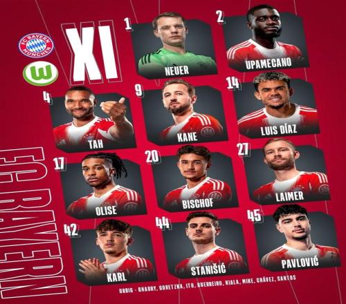 拜仁vs沃尔夫斯堡:卡尔首发,凯恩、迪亚斯、诺伊尔出战